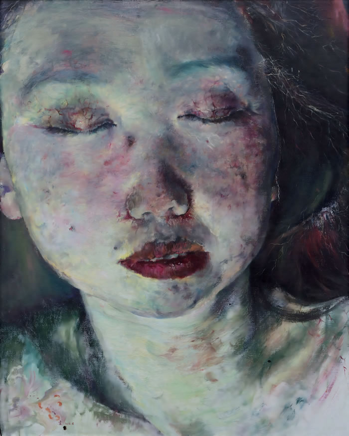 她在展览中创作的“网络中的人”系列。这些形象来源于网络空间中的数字个体。当这些形象被传播、被观看时,其主体性已然被削弱,成为可被读取却难以建立真实关系的存在。陈卉试图通过绘画,将这些被弥散的形象重新拉回肉身层面,赋予其重量、温度与不可替代性。在具体形象塑造上,她刻意回避光滑、完美与去瑕疵的视觉语言,转而强调斑点、毛孔、伤疤等通常被视为不美的细节。她认为,这些痕迹恰恰是生命真实存在过的证据,是灵魂外化的痕迹。相较于技术生成的完美表面, 这种不完美更具真实的美学价值, 也更接近人之为人的状态。