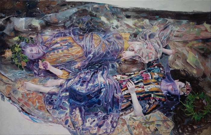 深受奥地利“分离派”艺术大家克里姆特风格影响的戴平均,在此次参展的作品《酒神》系列之一中,展现了其对特装饰性美学和象征深意的理解与创新。作品以水中仰卧的女神形象为核心,构画出一个浮游、失重的视觉场景:人物肌肤的写实细腻与周身缭绕的果蔬植物形成视觉的流动,突出了其对真实与象征的融合处理,又通过流动的背景与朦胧的光色氛围,赋予画面以中国古典绘画特有的氤氲之气。戴平均以“浮游”与“萦绕”作为核心意象,将无序的、狂欢的狄俄尼索斯酒神精神的能量,转化为一种内在的、沉浸式的精神漫游。水果与植物的漂浮状态,既是丰饶的隐喻,又暗示着生命在悬浮状态中的短暂与梦幻。画面既保持了中国神话主题——酒神仪狄的自由、浪漫,以中国文化特质表现出来,又是一幅光彩流丽的中国式神话再现。