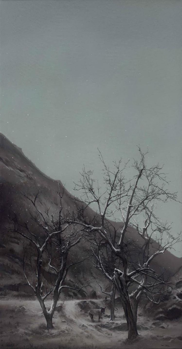 在这一系列中,杨永生不仅展现了其对西方古典油画材质语言的精湛掌控,更通过笔触的节制与肌理的微妙处理,赋予雪景以超越自然景观的精神性。雪覆山峦、寒林萧瑟的景象,既是对物理世界的观察,亦是对传统山水画中“荒寒”“寂寥”美学的当代回应。作品因而不再局限于风景写生的范畴,而成为一场跨越时空的意境重构——在以油彩为媒介的西方形式中,复苏了中国山水精神中独有的宇宙观与生命意识。