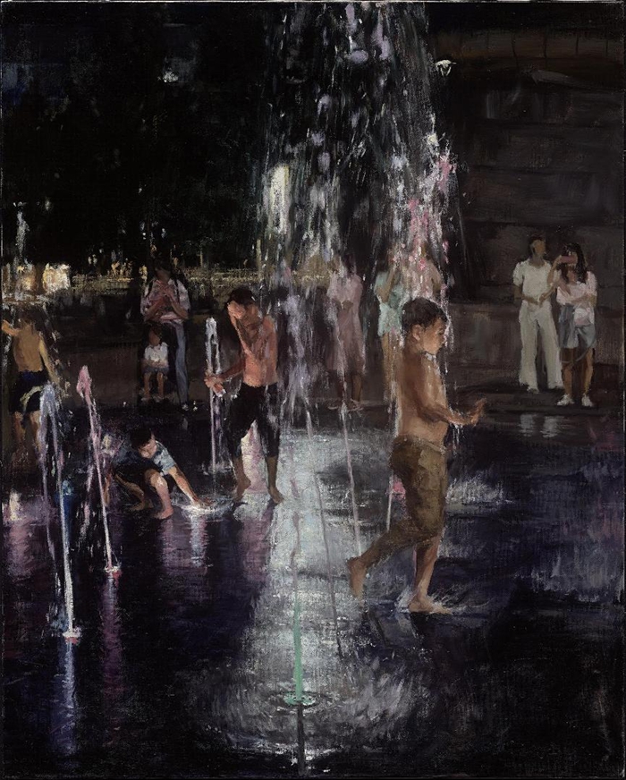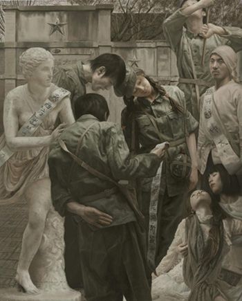 艺术家通过直接写生捕捉砖墙与厂门的物质肌理,将人物置于戏剧化的灯光与舞台调度之中,形成现实与表演的双重叠合。画面中出现的雕塑元素具有多层隐喻:它既是无生命的舞台道具,亦象征着西方艺术传统中纪念碑式的经典存在——冰冷、坚固,却在青年精神世界中占据不可动摇的地位。