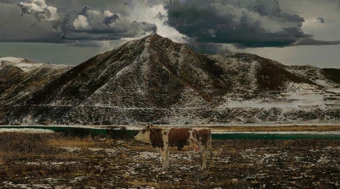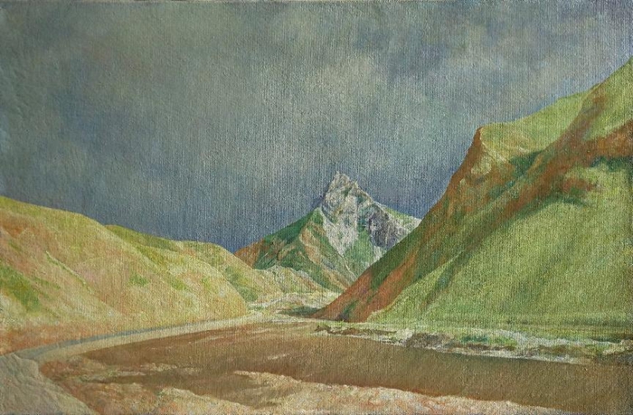 孙翊于2018年入西藏考察及返程途中,受川藏线三一八国道与丁青段沿途地貌的丰富性与视觉震撼,心有所触,将其转化为系列风景创作。参展并置的两幅作品,表面似分属春与冬,实则为同一季节中两处地理特质迥异的景观捕捉。艺术家通过冷暖色调体系的自觉运用与对比性构建,在高度写实的语言框架内,深刻揭示了西藏地貌在色彩、结构与氛围上的极端丰富性。