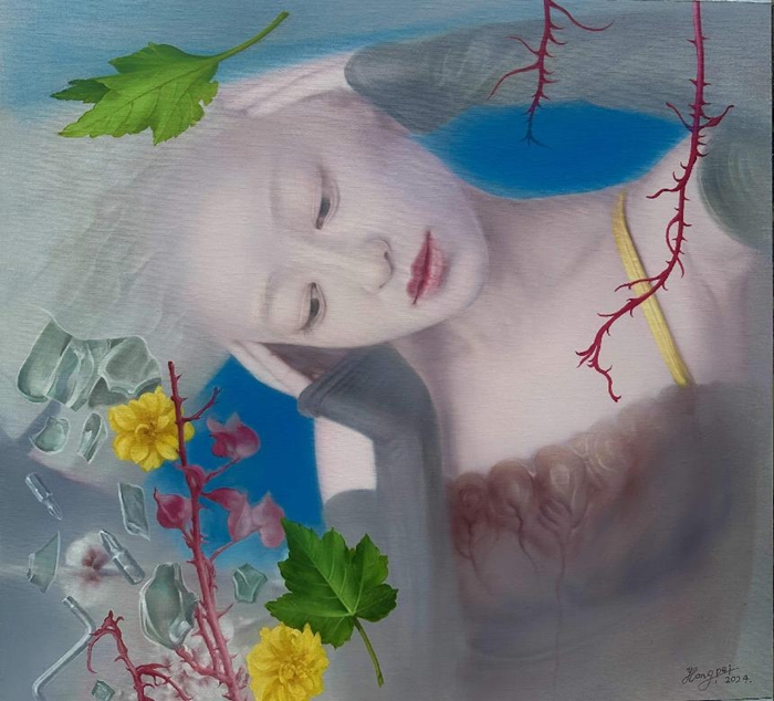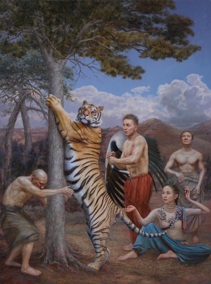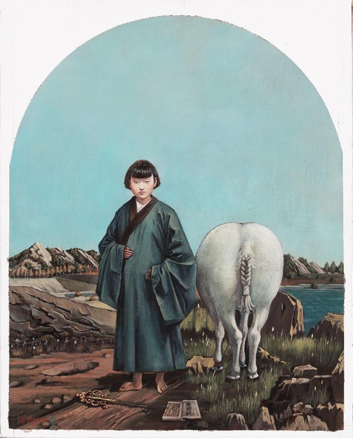 荆涛的《佛国记》则借助魔幻现实主义的视觉语言,营造出一种疏离而忧郁的精神气质。背向观者的白马、蓝衣少年、倾倒的锡杖与经卷等这些意象在非逻辑的并置中,形成了一种隐喻性的叙事结构。作品并不直接描绘现实,而是通过物象的象征与空间的悬置,折射出当代人在现实压力下的内在困顿与心灵遁逸的渴望,呈现出一种荒诞的逃逸美学。
