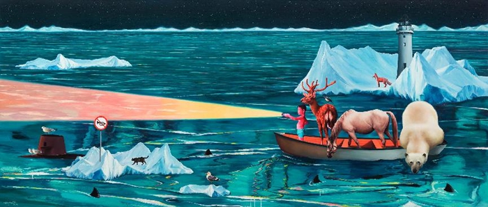 画面中,他将传统文化祥瑞象征的鹿、马与身处极地生存危机的北极熊共乘一舟,这一跨越文化与生态地域的并置,暗示着命运共同体在灾难面前的平等性与脆弱性。船头小男孩手持手电筒的动作,成为作品的核心意象:那束从儿童玩具中射出的光,既是对“光明”字面意义的视觉化,也是对人类在迷惘中寻求出路的精神象征。手电筒作为一代人的集体记忆载体,在此超越了日常物件的意义,转化为希望、探索与未来导向的符号。王晓勃通过这种举重若轻的符号转译,将生态焦虑转化为一种充满诗性且具感染力的图像叙事,构建出既具现实关切又富于想象维度的当代寓言体系。