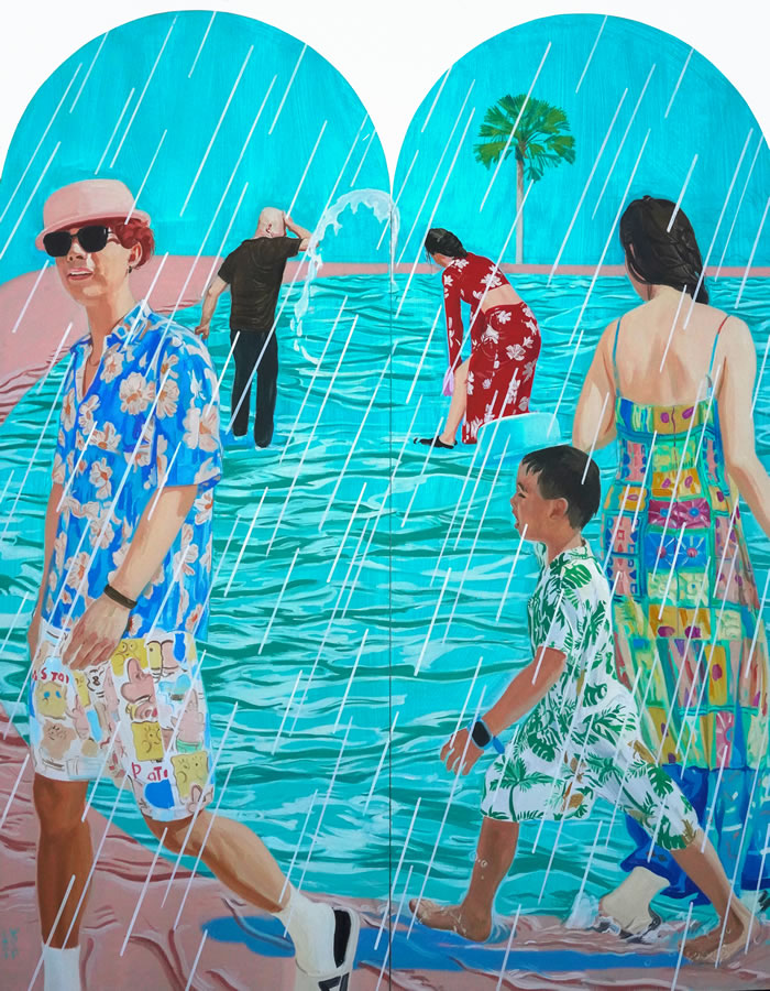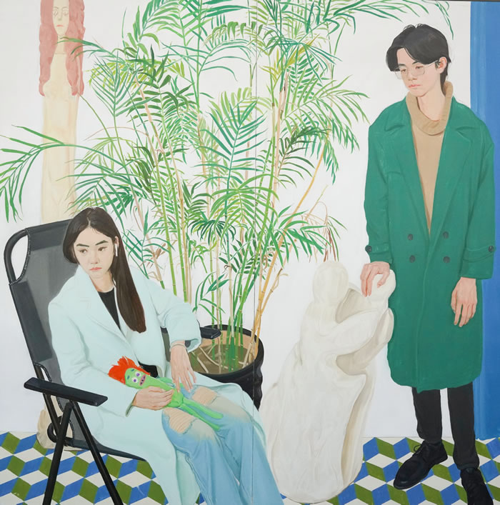 画面还时常被刻意制造成门窗的形状,像是他为自己准备的“紧急出口”,让人联想到古老教堂里的祭坛画边缘。但汪鹏飞并不考古,他所要的是让历史再次发生,或者说,今天发生的一切,至于明天,不也是历史吗?“我想用最原初的精神与愿望来画当下的日常模样”汪鹏飞说到。