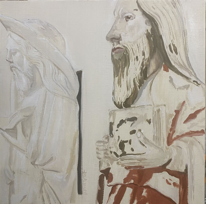汪鹏飞如同一个远行者,今时将目光聚焦或失焦在中世纪的绘画上——那是油画的出发地。在他的画中,类似湿壁画常用的纯粹青蓝、橙橘颜色被巨大的白色包裹在一个干净、质地透明的空间里,却用以刻画不经筛选的对象与场景,试着以一种“去抉择化”的方式来实现他所追求的“日常”。值得注意的是,画中的对象与场景并无须经汪鹏飞“亲眼”所见,而是来自图像的图像——图像已浩浩荡荡的跻身日常的日常。