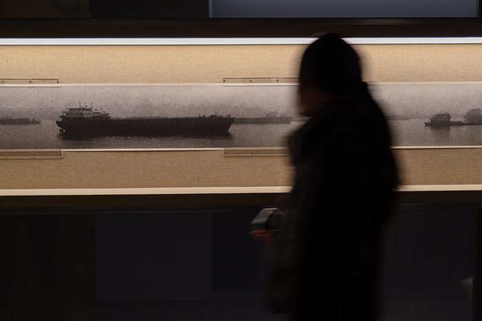 观众在展厅中的行走路径被精心设计,宛如漫步于园林或山径,视线在巨幅全景与微观细节之间转换,也随着景观的变化在黑白山水间穿梭。通过借鉴中国园林的“移步换景”理念,曲折的行进路径与错落的展墙关系引导着观者的步伐,从而延缓和延展其观看节奏和视角,在空间层面回应了秋麦作品所倡导的观看方式。