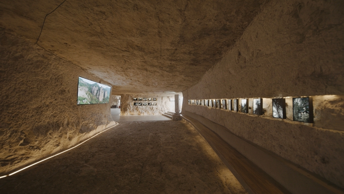 “山风耕骨”板块坐落于方洞景区的云端拾光岩洞,以影像艺术为核心呈现形式。来自中国美术学院跨媒体艺术学院的青年创作者以镜头为犁,深入岩层肌理,与亘古山风展开一场关于时间的视觉对谈。他们持续凝视石纹与山川,捕捉那些隐匿的变迁与循环,将群峰的静默、云雾的来去、光影的位移,用镜头编织成独特的影像“地质诗”。