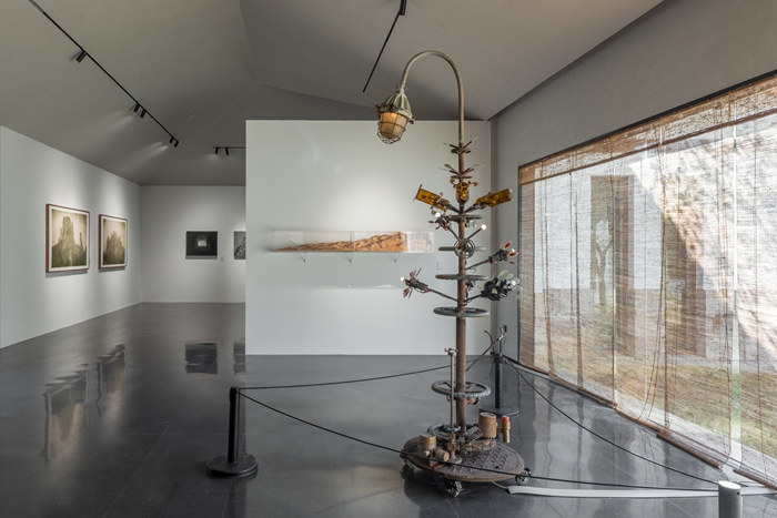 两件木雕作品安静地伏在地面上,其形态源于温州人熟悉的“海鲜”,以温润朴实的质感呼应在地生活记忆。一墙之隔的另一头,是一件由玻璃、工业残片构成的可动装置,两者均着力于材料自身的物质性与存在感,通过形态、质感与运动,唤起观者对自然物性与人工造物之间关系的静观。策展组表示希望观众在这里被邀请的是一种聆听式的观看,与作品中的山水、人文展开一种沉稳而持续的精神对话。