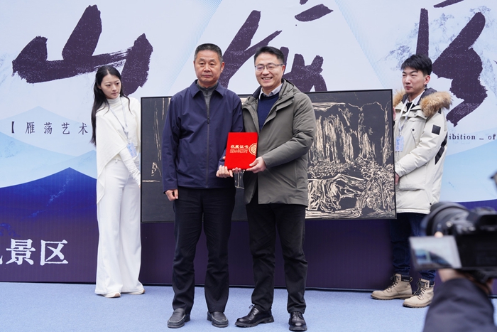 作为此次展览的策展人兼艺术家,张晓峰捐出木刻版画作品原版《雁山秋水》。中国美术学院社会合作处处长王益代表展览方,乐清市委常委、雁荡山管委会常务副主任王金法代表雁荡山风景名胜区交接作品,并颁发收藏证书。