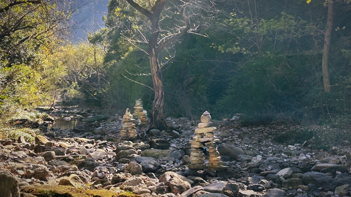 “天风无垠”是此次展览的特别板块,由三组装置作品组成。结合作品面貌与气质依地形、环境自然融入,与山岩、林木、房舍形成对话,散落在雁荡山三处户外空间之中。策展组希望观众能够在行走中不经意地与其“偶遇”,放下把艺术作品当作“对象”来观看的执着,让作品与自己从山里出发,终又回到风中。