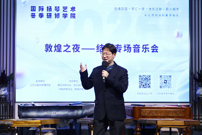 2月1日晚,敦煌之夜——结业专场音乐会在扬琴博物馆·仙音剧场精彩呈现,社会各界代表嘉宾到场观演,中央音乐学院教授、扬琴博物馆馆长刘月宁致感谢词,教育部语合中心原副主任、中华文化国际传播专业委员会理事长胡志平、上海民族乐器一厂总经理周力发表了热情洋溢的致辞。音乐会上,学员们不仅展示了7天每天1:30小时在各自两种主修扬琴形制技能研习上的快速精进,更以合奏、重奏等形式,展现了跨体系扬琴的对话与合作,特别值得一提的是,由魏研铭和刘月宁教授共同为致敬与纪念先辈们而全新编配的四重奏版《喜讯》的首演,深情优美的旋律感动在场观众,整场音乐会琴音交织,色彩斑斓,惊喜不断,寓意深远。