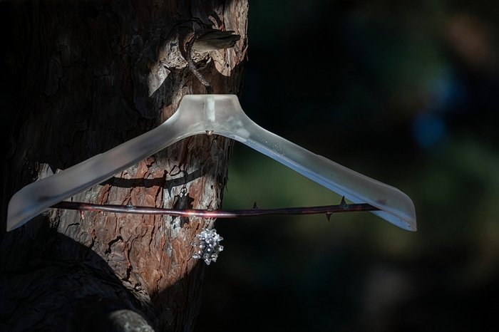 《折枝成途-起点》有效地呈现了这一概念,作为连接杜蒙创作中自然维度与人文维度的桥梁而存在。她围绕“刺”在当代艺术实践中常见使用方式所展开的持续讨论,在此达至高潮——通过一个高度情绪化的物件得以显现。衣架是全球衣橱中不可或缺的存在,是维系珍视衣物的重要工具;它的普遍性,使其同时象征着工作生活的共通性与循环性。当一件衣物悬挂于杜蒙的衣架之上,隐藏在织物背后的荆刺便开始了它们隐秘的生命,映射出那些每日不得不“重新穿戴”的个体所承受的内在不适与不满。她对这类情感与社会议题的坦率处理贯穿整个展览,即便作品所呈现的对象在气质上不断变化,这种探讨仍持续推进。