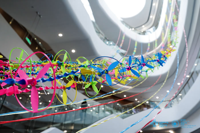现场嘉宾共同拨动并放飞手中的交互装置“飞天仙子”,象征着艺术精神在人民群众生活中的升腾与共鸣