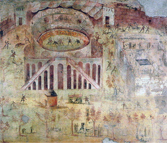 这幅壁画描绘了庞贝古城圆形剧场中庞贝城和努塞里亚之间的战斗。照片来源:维基共享资源