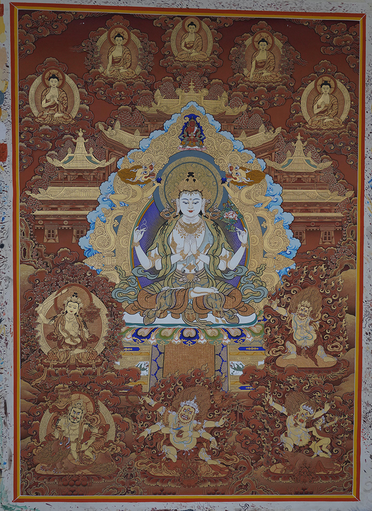 《红唐带彩四臂观音》,娘本,唐卡,102×74cm,2025