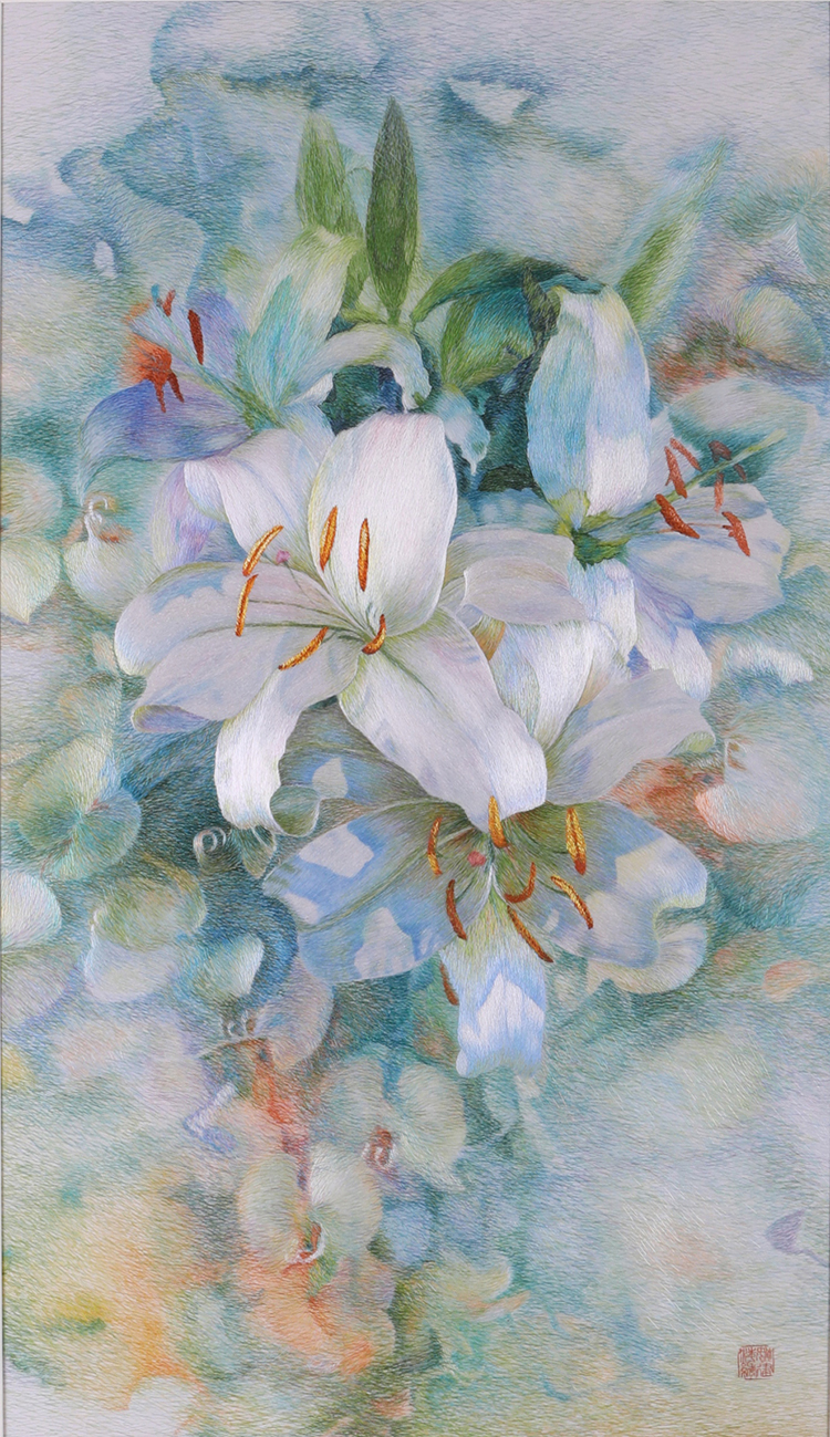 《中国梦·花韵系列-百合》,姚建萍,苏绣,152×87cm,2019年