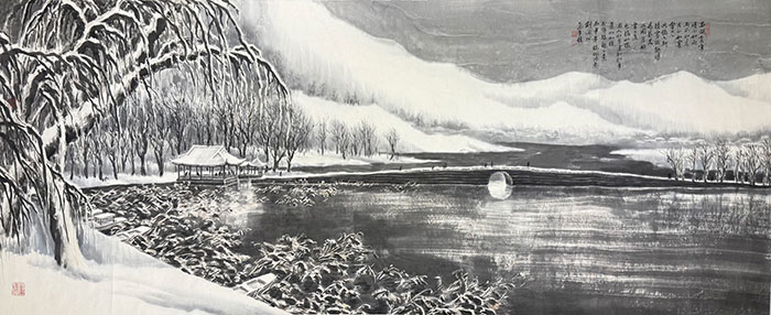 在谈到他以水面、月光、湖上汀州为灵感创作的现代水墨作品时,刘墉分享了他对唐代诗人王维的解读:“王维写‘清泉石上流’,写‘竹喧归浣女’,他不直接写浣女,只写竹林的喧响,这就是‘不着一物,尽得风流’。”以此为启发,刘墉的现代水墨作品将自己的画面切割、重组,加入线的元素,正是试图在现代视觉语境下,重现古典诗学的含蓄与张力。这正是展览着力营造的“温度”所在。它不是一个冷冰冰的学术陈列,而是一场可观、可游、可品的诗性体验。观众看到的不仅是画,更是一位文学家如何用视觉语言“写”出的诗。
