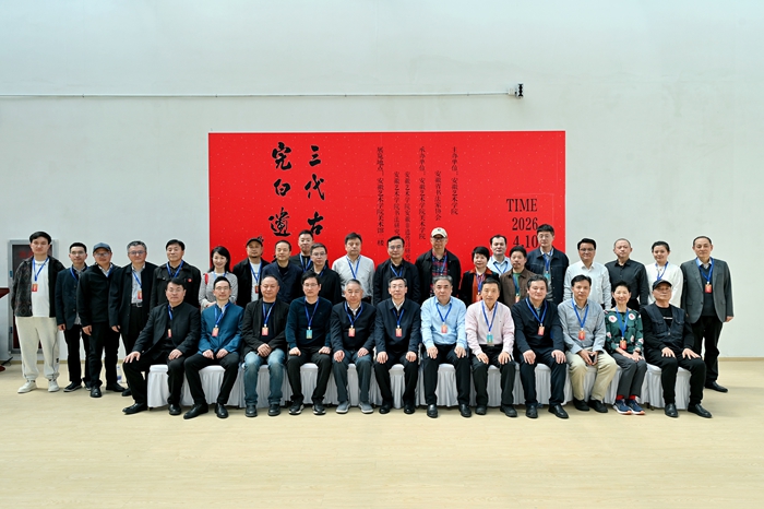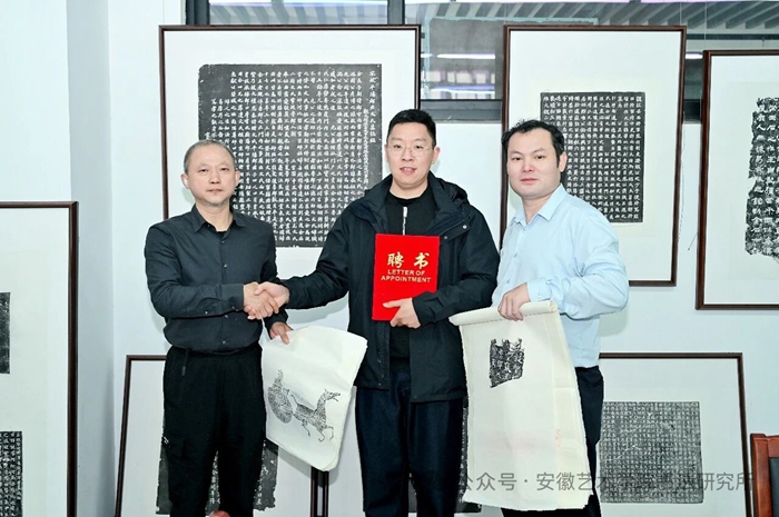 左起:安徽艺术学院美术学院特聘院长束新水、安徽大学汉字发展与应用研究中心博士赵冠群、安徽艺术学院书法研究所所长张典友