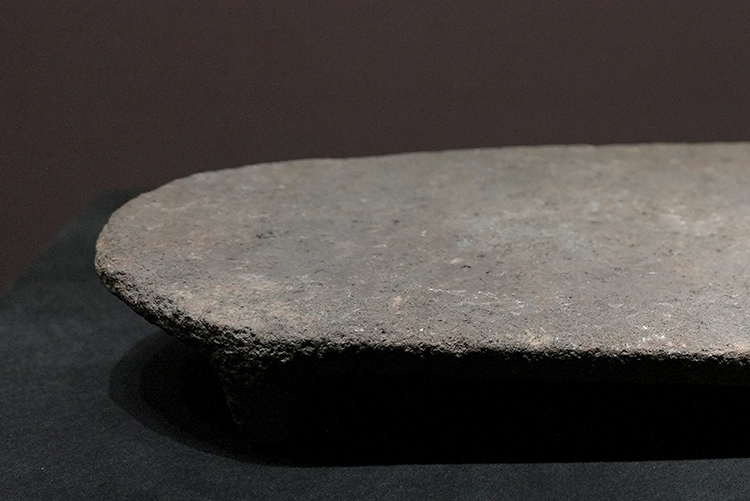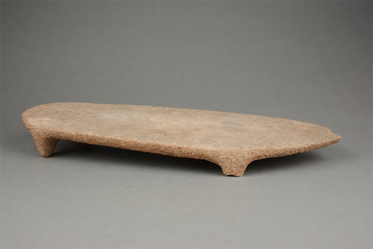 石磨盘一端为尖锐的三角形,另一端呈圆弧状,中间大体呈长方形,靠近三角底边位置略宽,至弧状顶端变窄,边缘略薄,中间略厚。盘与足相接处弧线流畅,体现了早期人类朴素的美感。石磨盘下方下有四个较为短小的矮足,敦实稳重,放到平面上非常稳当。由此可见,新石器时代的先民已经懂得将造型美与实用主义完美结合。