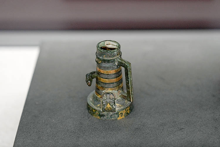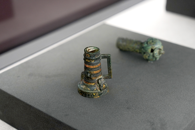 展出的这件“错金银铜车軎”出土于平山战国中山王墓,装饰错金银花纹,两端为卷云纹,中部则为错金相间。
