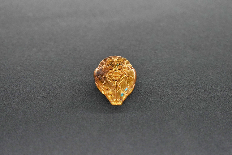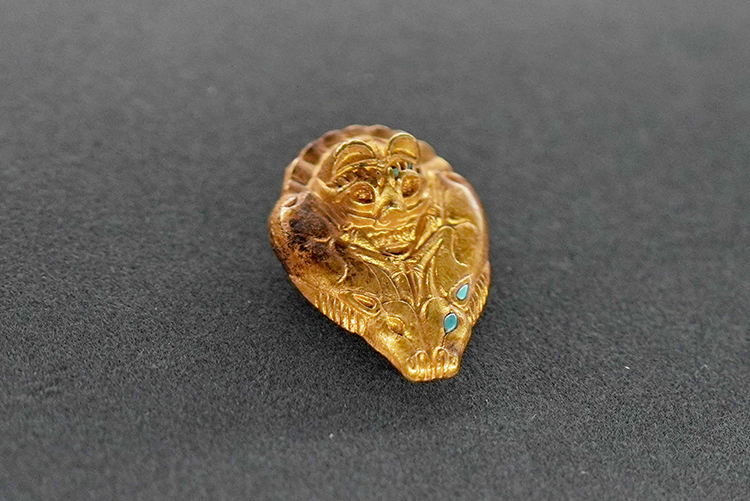 这件金饰略呈桃形,正面微鼓,中间上方为熊首纹,向下对称雕饰头相背的双羊纹,羊前肢朝外,后肢蜷曲于正中。熊的眼、眉、口及长角羊的眼、耳均有镶嵌绿松石,虽然多处已经脱落,但仍能感受到那份曾经的华丽。
