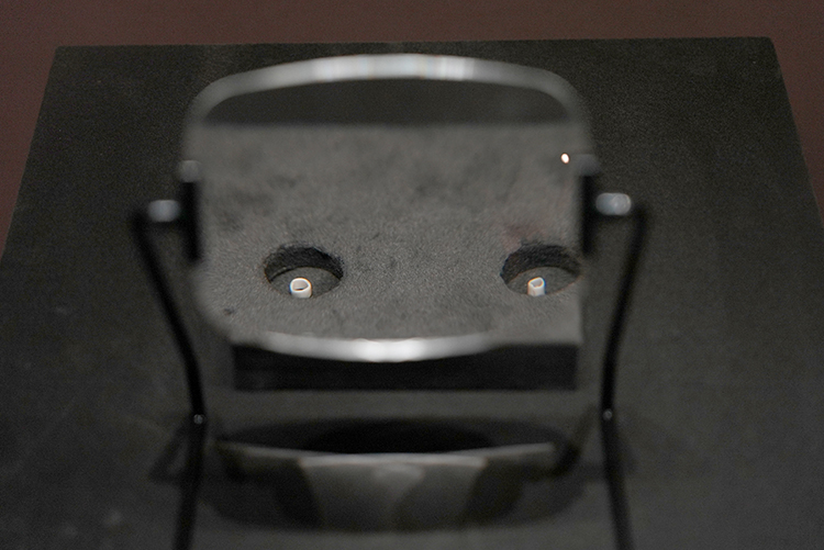 这件小小的管饰品需要借助现场的放大镜来观看,其来自于遥远的旧石器时代,发掘于今张家口阳原县桑干河畔的于家沟遗址,这里属于庞大的泥河湾史前遗址群的一部分,反映了一万年前旧石器时代人类的活动状况。展品中这件鸟管状骨珠,管身中空,形制小巧,表面经打磨。