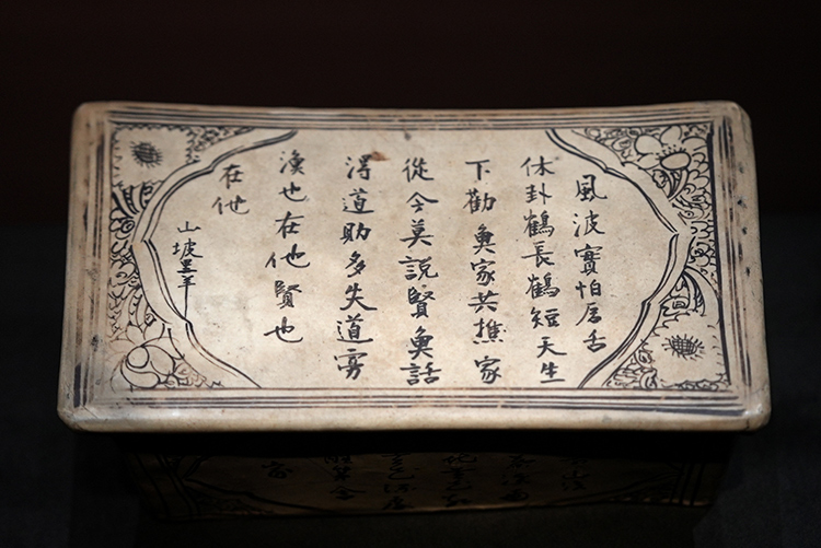 这件白地黑花“山坡里羊”长方形枕出土于邯郸磁州窑。其枕呈长方形,枕面开光,内墨书元代陈草庵存世的26首《山坡羊》小令之一:“风波实怕,唇舌休卦(挂),鹤长鹤(凫)短天生下。劝鱼(渔)家,共樵家,从今莫说贤鱼(愚)话。得道助多失道寡,渔(愚)也在他,贤也在他。”这首小令告诫世人莫以口舌议论他人,以免惹是生非,不用去评论他的贤或愚。