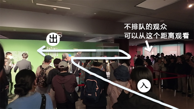 一,欣赏长信宫灯不一定非要排队:实际上观众可以直接上五层展厅内观看,只是现场有隔离带所以与展品有点距离,但最近距离也有2-3米左右,无论是直接观看还是手机拍照都可以看得很清楚。而排队的观众虽然可以近距离隔着玻璃柜欣赏,但是不能过久驻足,现场会有工作人员指挥调度,观众绕着展品玻璃柜转一圈后就需要离开了。所以推荐观众可以直接上五楼展厅观看,如果觉得确实需要近距离欣赏的话再下楼排队也不迟。具体现场情况如下图: