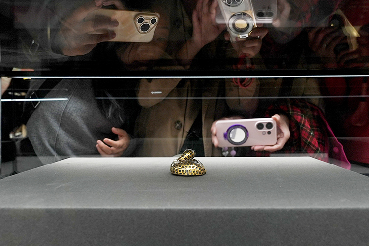 豹子身躯用金银错出梅花状的豹斑,头、足和尾部则作点状纹。嘴巴涂着红色,双目镶嵌白玛瑙,显得炯炯有神,活灵活现,感觉随时要站起来的样子。正因为这样的精致与灵动,小豹子吸引了众多观众,受欢迎程度从下图中的手机数量可见一斑: