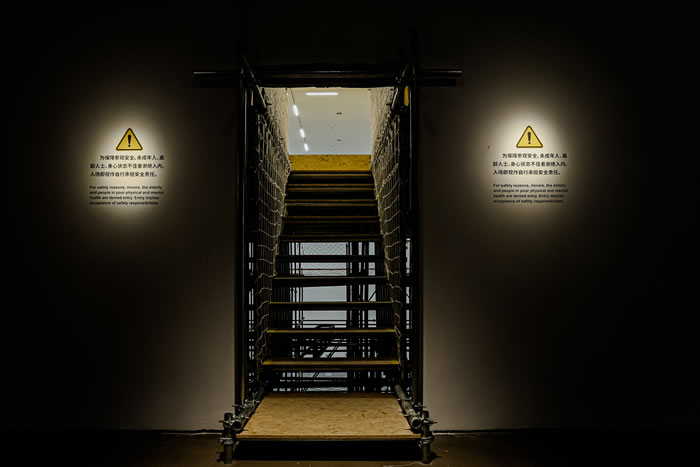马得的全新委任作品以12.4米通高体量横跨美术馆2至3层中庭,以建筑脚手架与木龙骨搭建出一座悬置的思辨平台。观众在不同楼层、不同角度的每一次注视,都成为对“观看位置”本身的追问。