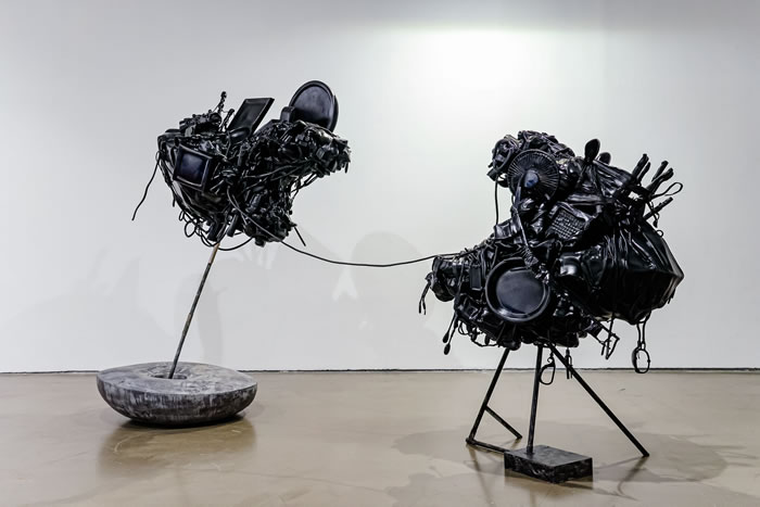 方二&孟瑾,《敏感场曼波》2026;一组2件,150×110×210cm,130×100×140cm;光敏树脂、金属,水泥、电缆、皮革