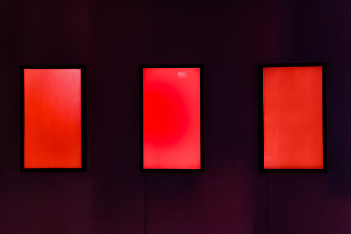 高振鹏,《三种红色》2021;单件 120×70×8cm,共三件;画布丙烯,灯箱,显示器,切光灯,原木画框