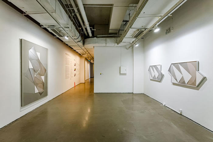 廖斐,《局部被遮蔽的圆》(10、6a、6b);223×163.5×7cm、163×78.5cm、163×78.5cm;哑银卡纸,油漆笔着色