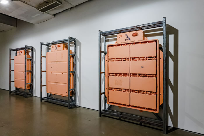 张鼎,《电池》 #1 #5 #6 2023;205 (H)×153 (W)×19.5 (L) cm, 205 (H)×153 (W)×19.5 (L) cm, 205 (H)×153 (W)×19.5 (L) cm;硅胶、铝合金、不锈钢、纹身墨水