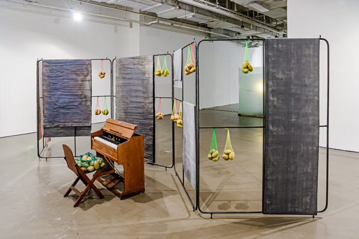 李怒,《屏风是屏什么风?》2026;屏风单屏尺寸 210×150×2cm,组合尺寸可变;铁,铅皮,橡胶,土豆,尼龙网兜,脚踏风琴,椅子